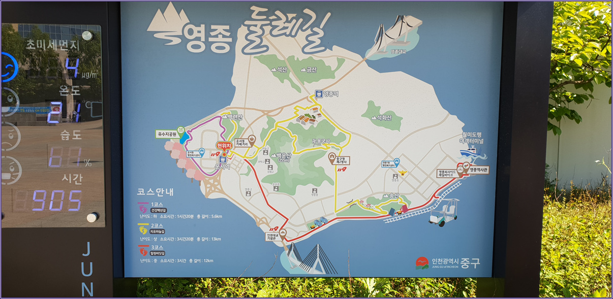 - 코스 : 신도항- 신도수변공원-구봉산-연도교- 시도 수기해변-연도교-모도 배미꾸미조각공원- 모도마을회관